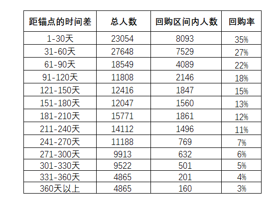 区间的界定有一定灵活性,回购分析区间的时间要尽量覆盖锚点前用户的预期复购时间,不能太短,一般会在3个月以上。