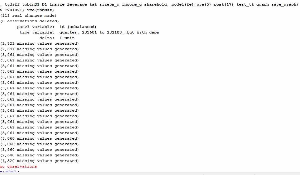 本人用tvdiff做多时点DID凭兴趣是假设时,stata显示no observations,请问是怎么回事。以下是我的命令:tvdiff tobinQ1 D1 lnsize leverage tat sizeps_g income_g sharehold, model(fe) pre(5) post(17) test_tt graph save_graph(TVDID21) vce(robust)