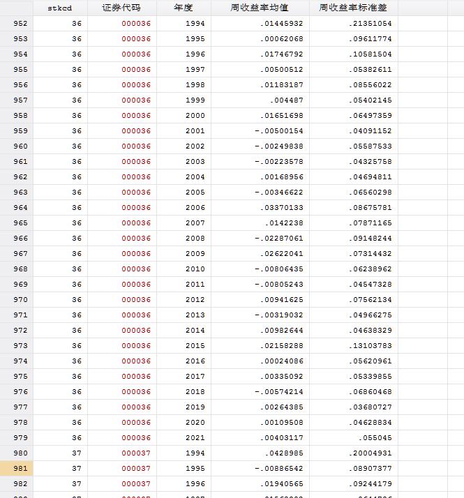 数据中包含的信息为证券代码、年度、周收益率均值、周收益率标准差