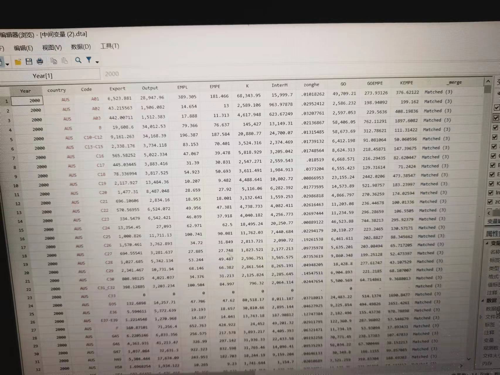 我的数据是这样的,有大概43个国家的56个行业,从2000至2014年的行业层面的数据(如图一)。还有一个是只有从2009到2014年的国家层面数据(如图二)在横向合并时为什么按m:1合并出来结果是图二的数据没有合并到图一中?请大佬解释一下以及如何处理?从第一行右往左为图一到图二