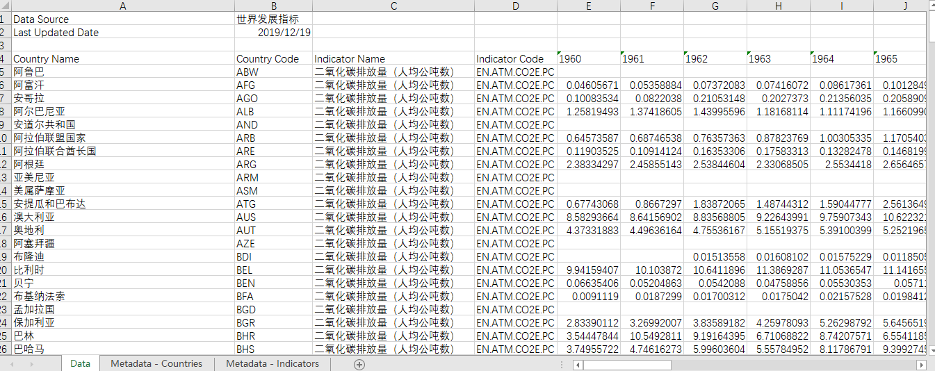 各国二氧化碳排放量(人均公吨数)1960-2014年