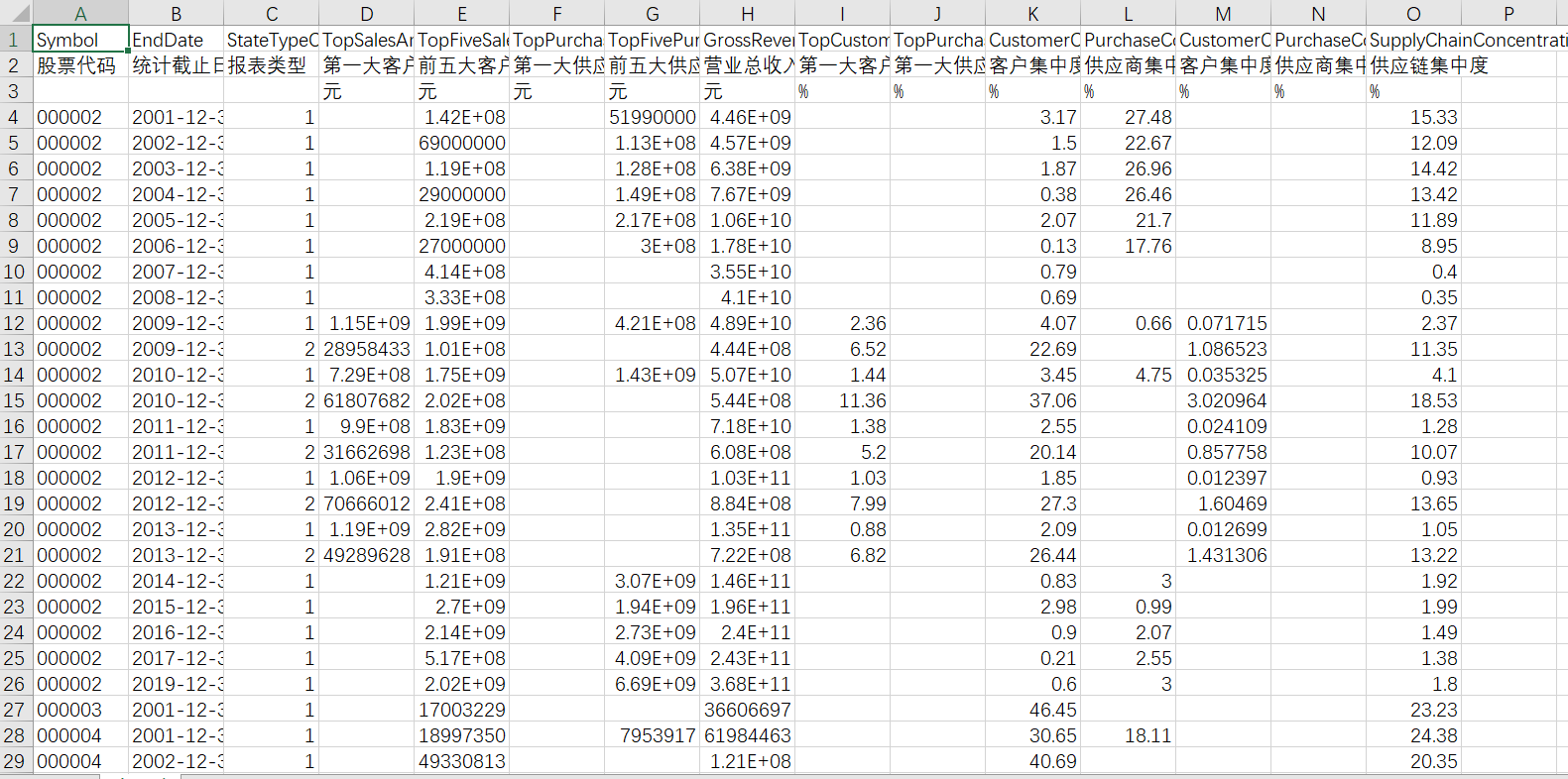就一张表,包括了 股票代码、统计截止日期、报表类型、第一大客户销售额、前五大客户销售额、第一大供应商采购额、前五大供应商采购额、营业总收入、第一大客户销售额占总销售额比率、第一大供应商采购额占总采购额比率、前五大客户销售额占年度总销售额比率(客户集中度)、前五大供应商采购额占年度总采购额比率(供应商集中度)、供应链集中度(向前5大供应商、客户采购销售比例之和的均值,即:(向前5名供应商采购比例+向前5名客户销售比例)/2)、客户集中度赫芬达尔指数(前五大客户销售额占总销售额比率平方之和)、供应商集中度赫芬达尔指数(前五大供应商采购额占总采购额比率平方之和)