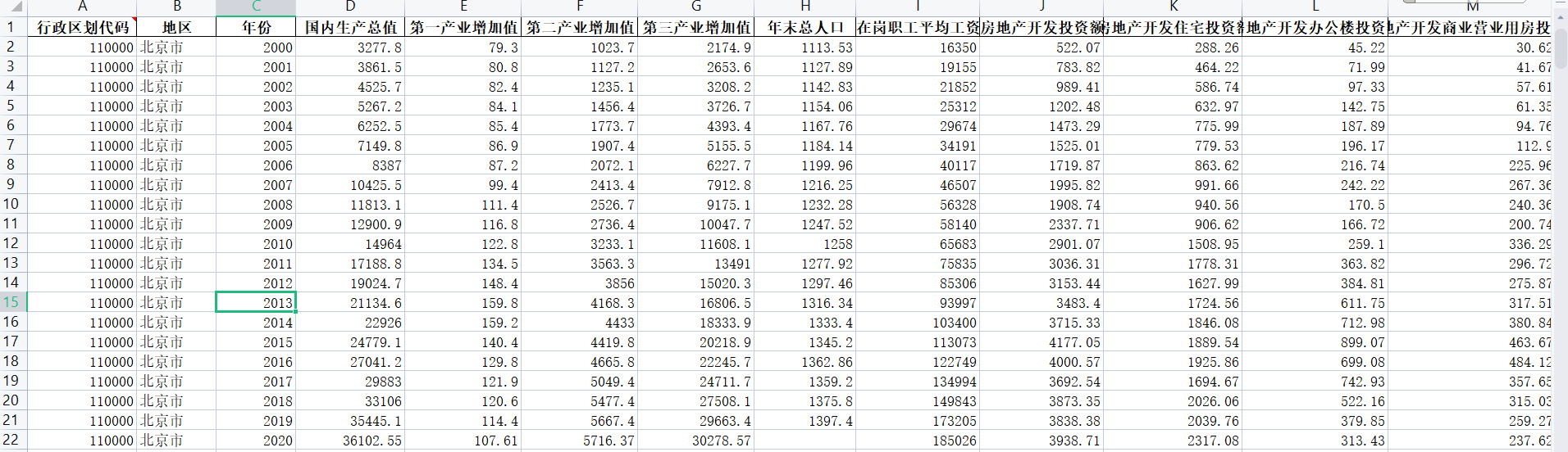 | 年末总人口 | 在岗职工平均工资 | 房地产开发投资额 | 房地产开发住宅投资额 | 房地产开发办公楼投资额 | 房地产开发商业营业用房投资额 | 房地产开发企业施工房屋面积 |