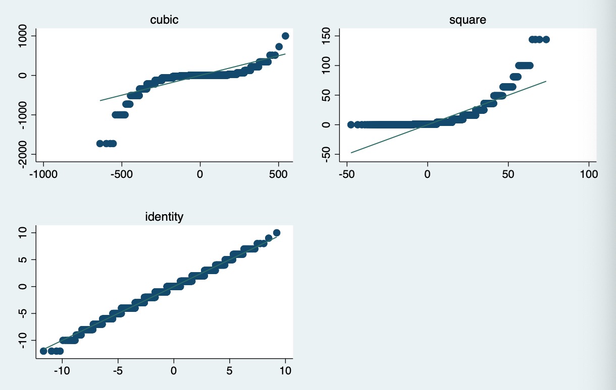 我用qladder y这个命令生成了三幅图,其中identity这张是不是表示我这个因变量是线性的呢?这个因变量偏度接近于0,峰值为3.2。我打算接下来做多元线性回归,不知道以上信息是否可以确认因变量为正态分布(样本量为1000左右)?或者还需要做什么检验呢?