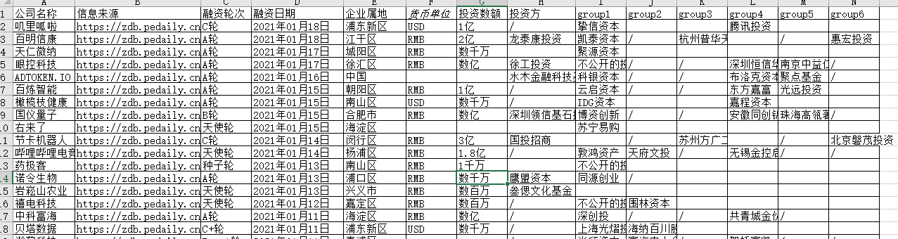 数据说明:数据包括公司名称、融资轮次、融资日期、企业属地、货币单位、投资数额、投资方等。