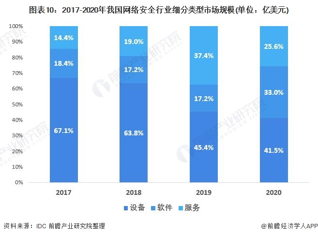 从细分类型来看,2017-2020年,网络安全设备市场规模维持在30亿美元左右,2020年为32.7亿美元,但规模占比逐年递减,2020年占行业总规模的41.5%,同比降低3.9个百分点;软件和服务市场近几年有明显上升趋势,2020年规模占比分别为33.0%和25.6%。整体来看,网络安全行业市场之间呈“三足鼎立”态势。