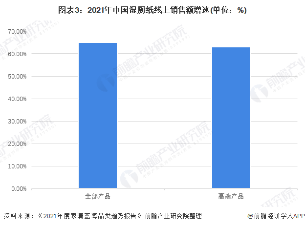 京东联合益普索发布的《2021年度家清蓝海品类趋势报告》显示,2021年中国湿厕纸线上销售额增速较快,全部产品销售额增速达到65%,其中高端产品增速达到63%。
