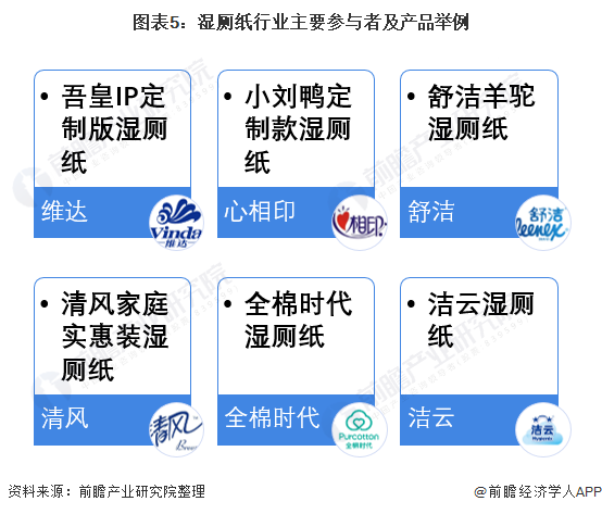 从湿厕纸行业主要参与者看,大部分为传统纸巾品牌,包括维达、心相印、清风等。从各品牌的产品看,IP定制款产品较多,可以发现利用消费者喜爱的IP形象推出联名款产品已经成为行业内较为流行的营销方式。