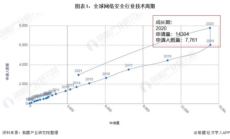 2010-2020年,全球网络安全行业专利申请人数量及专利申请量逐年递增,且自2018年开始,每年专利新增申请数量均在1000项以上。但专利申请人数量整体基数较小,说明行业技术集中在少数的申请人手中。