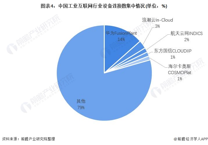 2019年8月工信部发布了国内前十大跨行业、跨领域工业互联网平台Top10清单,并对工业互联网平台研发创新能力、应用实现能力、发展能力做出评估,并表示中国重点工业互联网平台平均工业设备连接数达65万台。因此,前瞻通过对我国工业互联网平台设备总连接数测算中国工业互联网行业设备连接数集中情况。可见行业CR5占21%的市场,其中华为FusionPlant工业互联网平台设备连接数占比达14%。