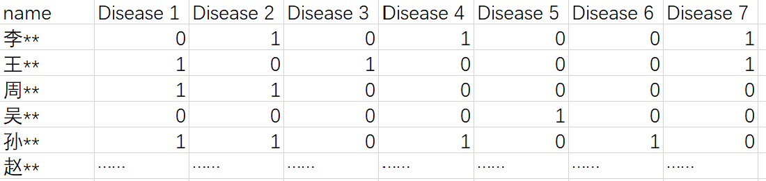 如下图,目前分析7种疾病,每个人可能患disease1+disease2,或disease2+disease3,或disease1+disease5+disease6……。