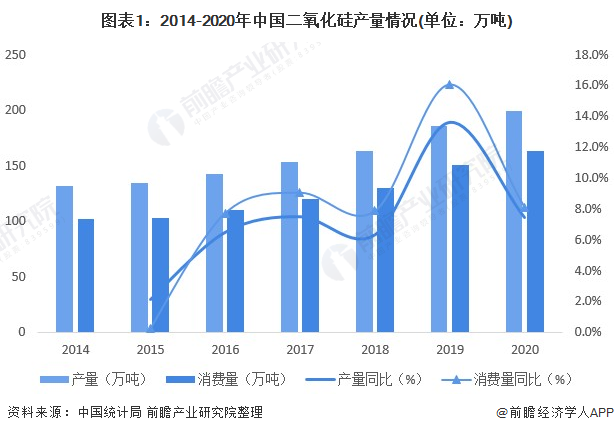 根据《中国橡胶工业年鉴》数据显示,2014-2020年,我国二氧化硅产量从131.3万吨增长至199.2万吨。消费量方面,根据《中国橡胶工业年鉴》数据显示,2014-2020年,我国二氧化硅需求量从150.56万吨增长至162.7万吨。整体我国二氧化硅供大于求,产品完全自足,且自2016年起消费量增速高于供给增速,内需持续扩大。