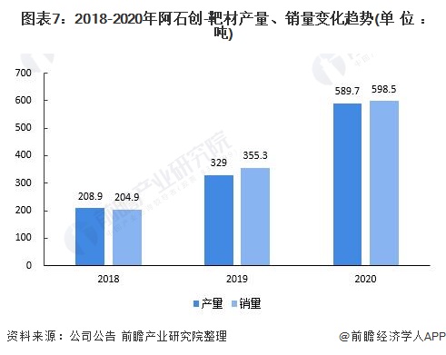 2018-2020年,阿石创靶材产销量呈上升趋势。2020年,公司靶材产、销量分别达到589.7吨与598.5吨。