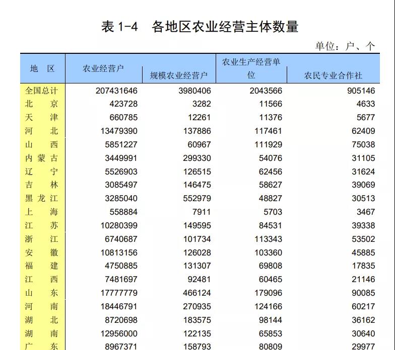 数据说明:全国农业普查是一项重大国情、国力调查。它是按照国家规定的统一方法、统一时间、统一表式和统一内容,主要采取普查人员直接到户、到单位访问登记的办法,全面收集农村、农业和农民有关情况,为研究制定农村经济社会发展规划和新农村建设政策提供依据,为农业生产经营者和社会公众提供统计信息服务。世界大多数国家都以十年或五年一个周期开展农业普查。