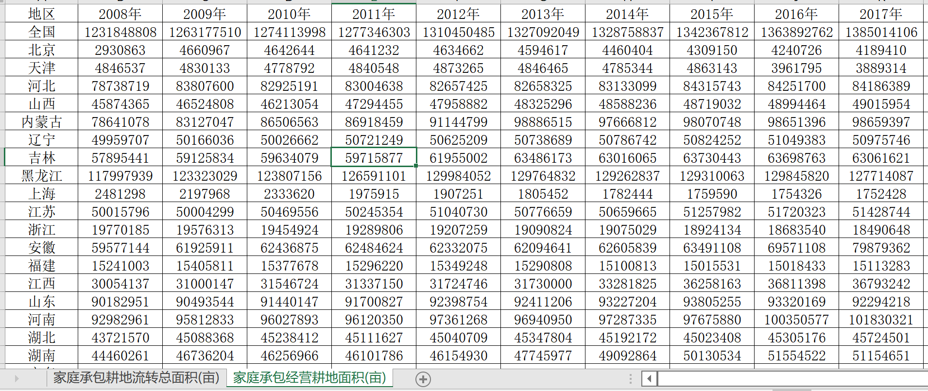 三、各省家庭承包耕地流转总面积及经营耕地面积【2005-2020年】