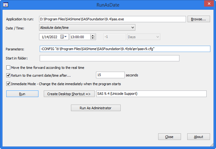 (3)使用RunAsDate自动修改时间。只要设置一次,之后每次启动都和直接打开SAS没区别。