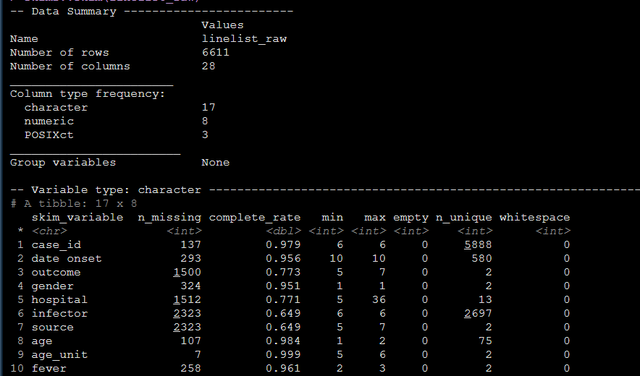 skimr::skim(raw)函数的输出包括整体的数据有多少行多少列,列的不同类型(数值,字符,时间)有几种,然后不同的列的类型还会输出我们关心的指标,比如字符型的列都会有每一列的缺失比例,极值,非重复值,空白等: