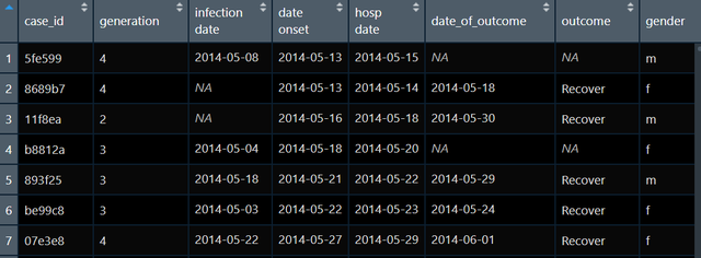 raw %>% janitor::clean_names() %>% rename(date_infection = infection_date, date_hospitalisation = hosp_date, date_outcome = date_of_outcome)运行代码后我们就可以看到所有设定的列名都被改好了。