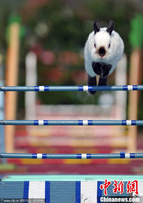 近日,德国一村庄举办了一场别开生面的小兔障碍赛。这项运动现已传到其他欧洲国家、美国、加拿大、甚至是日本。各地的比赛规则各异,但是通常来说,兔子跳过的障碍越多,得分也越高,有些比赛还有时间限制。瑞典兔子跳跃网站数据显示,兔子的世界跳高纪录是99.5厘米,而跳远纪录则是惊人的3米。图片来源:CFP/视觉中国