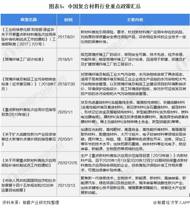 复合材料作为各行各业的新需求的支柱产业,其发展离不开政策的支持和推动。由于我国复合材料行业发展起步较晚,高端复合材料的发展仍处于空窗期,为鼓励国内企业进行复合材料研发,2020年12月,我国出台了《关于开展重点新材料首批次应用保险补偿机制试点工作的通知》,生产规定新材料产品的企业,科申请提出保费补贴申请。
