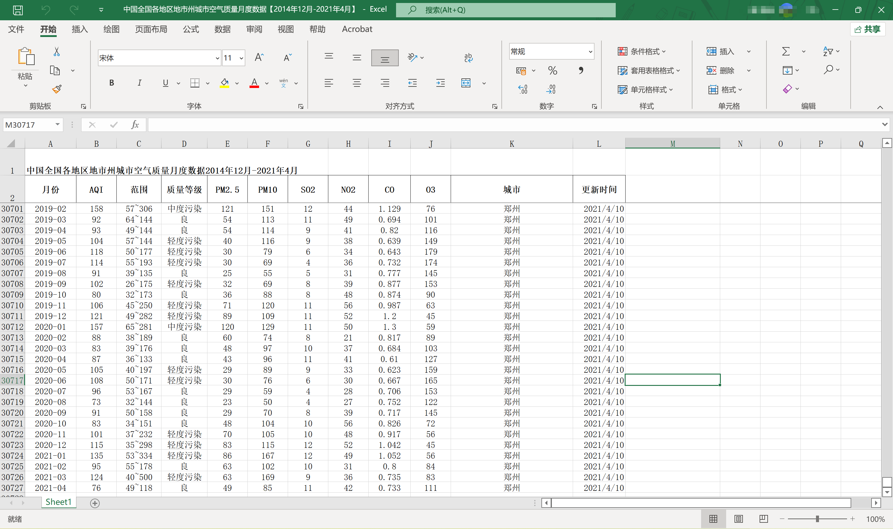 中国全国各地区地市州城市空气质量月度数据【2014年12月-2021年4月】