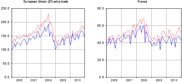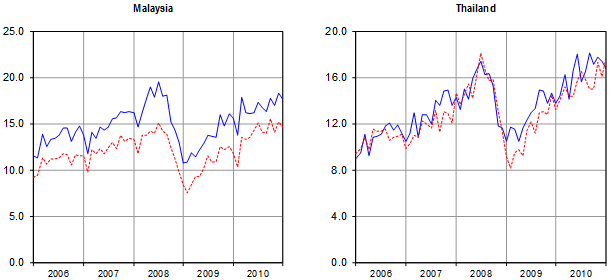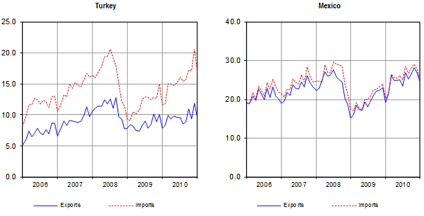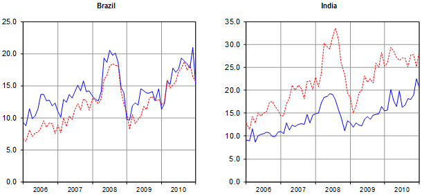 Exchange rates and trade balances Trade imbalances of leading economies widened in 2010, as exports and imports bounced back from their depressed levels of 2009. However, for most countries the gap between exports and imports was smaller after the crisis than before (Appendix Chart 1). The monthly trade deficit of the United States widened from a low of $32 billion in February 2009 to around $62 billion per month on average in the second half of 2010, and the deficit for the year increased 26% compared to 2009. However, the 2010 deficit of roughly $690 billion was 22% less than the corresponding deficit of $882 billion in 2008. China’s merchandise trade surplus for 2010 totalled $183 billion, roughly 7% less than the $196 billion it recorded in 2009, and 39% less than the nearly $300 billion surplus of 2008. The European Union’s had a trade deficit with the rest of the world of $190 billion in 2010, which was up 26% from 2009 but down 49% from the $375 billion it recorded in 2008. Japan was an exception to the trend towards smaller trade deficits/surpluses after the crisis. In 2008 the country recorded a $19 billion surplus of exports over imports, but this nearly quadrupled to $77 billion in 2010. In terms of exchange rates, by February 2011 the Yuan had appreciated against the US dollar in nominal terms by around 3.8% from its previous level. However, real appreciation against the dollar is happening at a faster rate due to higher inflation in China. China’s real (i.e., inflation adjusted) effective exchange rate against a broad basket of currencies rose 1.3% in 2010 according to indices supplied by J.P. Morgan. By comparison, the US dollar registered a 5% real effective depreciation against trading partners’ currencies during the same period. The yen appreciated by nearly 7% in nominal terms against the dollar in 2010, but its real effective rate was only up by less than 1% on account of a falling price level (i.e. deflation) in Japan. This suggests that the higher value of the yen did not hurt the competitiveness of Japanese goods on world markets. On the other hand, the strong nominal appreciations of the Brazilian real (12%) and the Korean won (10%) against the dollar were matched by large real effective rises (15% and 9%, respectively) that would have raised the cost of goods from these countries relative to other countries’ exports. | ||