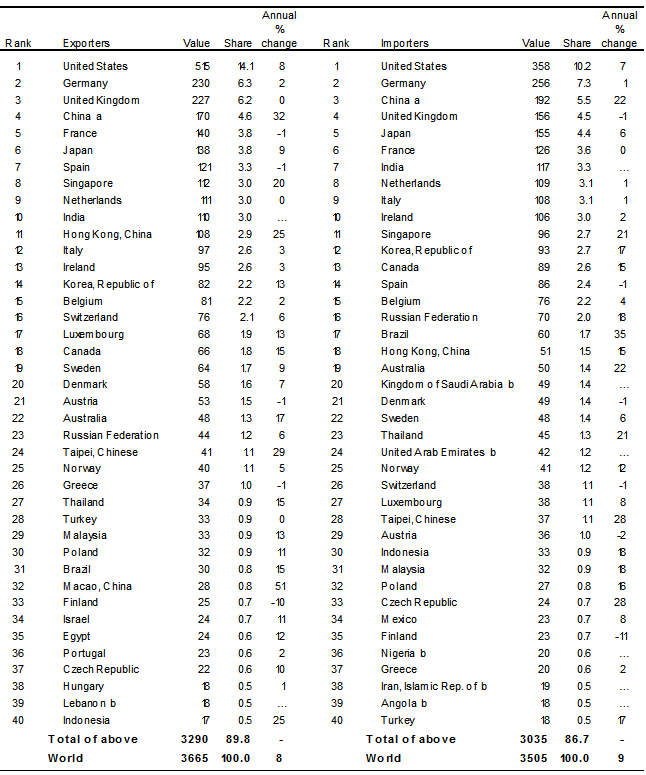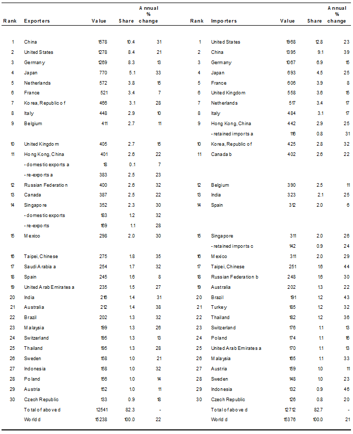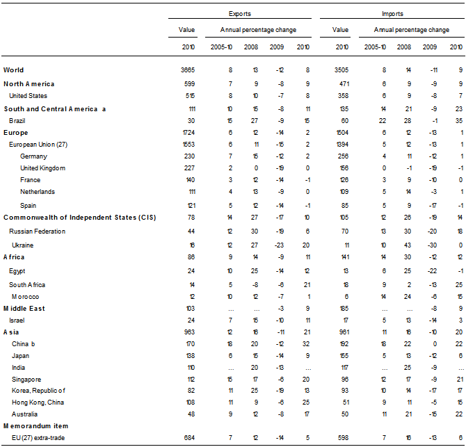 Appendix Table 1 World merchandise trade by region and selected economies, 2010 $bn and % ![]() a. Imports are valued f.o.b. b. Includes the Caribbean. For composition of groups see the Technical Notes of WTO, International Trade Statistics, 2010. c. Algeria, Angola, Cameroon, Chad, Congo, Equatorial Guinea, Gabon, Libya, Nigeria, Sudan. d. Hong Kong, China; Republic of Korea; Singapore and Chinese Taipei. e. Common Market of the Southern Cone: Argentina, Brazil, Paraguay, Uruguay. f. Association of Southeast Asian Nations: Brunei, Cambodia, Indonesia, Laos, Malaysia, Myanmar, Philippines, Singapore, Thailand, Viet Nam. Source: : WTO Secretariat. Appendix Table 2 World exports of commercial services by region and selected country, 2010 $bn and % ![]() a Includes the Caribbean. For composition of groups see Chapter IV Metadata of WTO International Trade Statistics, 2010. b Preliminary estimate. Note: While provisional full year data were available in early March for 50 economies accounting for more than two thirds of world commercial services trade, estimates for most other countries are based on data for the first three quarters. Source: WTO Secretariat. Appendix Table 3 Merchandise trade: leading exporters and importers, 2010 $bn and % ![]() a. Secretariat estimates. b. Imports are valued f.o.b. c. Singapore’s retained imports are defined as imports less re-exports. d. Includes significant re-exports or imports for re-export. Source: WTO Secretariat. Appendix Table 4 Merchandise trade: leading exporters and importers (excluding intra EU (27) trade), 2010) $bn and % ![]() a. Secretariat estimates. b. Imports are valued f.o.b. c. Singapore’s retained imports are defined as imports less re-exports. d. Includes significant re-exports or imports for re-export. Source: WTO Secretariat. Appendix Table 5 Leading exporters and importers in world trade in commercial services, 2010 $bn and % ![]() a Preliminary estimate. b Secretariat estimate. Note: Figures for a number of countries and territories have been estimated by the Secretariat. Annual percentage changes and rankings are affected by continuity breaks in the series for a large number of economies, and by limitations in cross-country comparability. See the Metadata. Source: WTO Secretariat Appendix Table 6 Leading exporters and importers of commercial services excluding intra-EU (27) trade, 2010 $bn and % ![]() a Preliminary estimate. b Secretariat estimate. Note: Figures for a number of countries and territories have been estimated by the Secretariat. Annual percentage changes and rankings are affected by continuity breaks in the series for a large number of economies, and by limitations in cross-country comparability. See the Metadata. Source: WTO Secretariat Appendix Chart 1 Monthly merchandise exports and imports of selected economies, Jan. 2006 - Jan. 2011 (Billion dollars) ![]() ![]() ![]() ![]() ![]() ![]() ![]() ![]() ![]() Sources: IMF International Financial Statisitics, Global Trade Information Services GTA database, national statistics. | ||