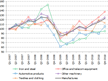 Chart 5: Nominal dollar exchange rates, January 2000 - February 2011 Indices of US dollars per unit of national currency, 2000=100 ![]() Source: Federal Reserve Bank of St. Louis | ||