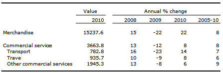 What may be less clear is why imports are estimated to increase as a result of a disaster. This is because any major reconstruction or rebuilding of damaged infrastructure will likely increase imports, since the required materials, technology or skills may need to come from abroad. This should outweigh any drop in import demand stemming from lost output and income. Some of the economic impact of the earthquake could be transmitted to other countries through global supply chains. Anecdotal evidence is already being reported on shortages of Japanese auto parts and electronic components in other countries, and on ships being unable to unload perishable food in Japan because of a lack of refrigeration due to reduced electricity supplies. However, less output and trade in one quarter will probably be followed by increased activity in subsequent quarters, so the cumulative effect over the course of the year may not be large. The prospect of sharply higher oil prices probably poses a greater threat to the world economy and trade than the Japanese earthquake. Fears of a prolonged conflict in Libya and spreading unrest in the Middle East have lifted oil prices above $100/barrel. An interruption of supplies from any other major producer would raise prices higher still, with potentially significant implications for the global economy. In such an event, the WTO would have to revisit its trade projections. The above estimates of export growth are supported by the results of the WTO Secretariat’s time series forecasting model,5 which predicts a 4.5 per cent increase in demand for imported goods and services in 2011 on the part of developed economies (or more precisely, the members of the Organisation for Economic Cooperation and Development, or OECD) (Chart 7). Chart 7: Real GDP and trade growth of OECD countries, 2008-10 % change over same quarter in previous year ![]() Note: Q4-2010 exports and imports estimated based on available data. Source: OECD Quarterly National Accounts. Appendix World merchandise exports in volume terms (i.e. excluding the influence of prices and exchange rates) rose 14.5% in 2010, while world imports grew 13.5%. In principle, world exports and imports should increase at roughly the same rate, with some discrepancies due to differences in data recording across countries. World trade as measured by exports grew 4 times as fast as global GDP in 2010, whereas trade normally grows about twice as fast as GDP. (Table 1). Only in Asia and North America did exports grow faster than the world average (15.0% and 23.1%, respectively), whereas slower than average growth was recorded in South and Central America (6.2%), Europe (10.8%), the CIS (10.1%), Africa (6.4%), and the Middle East (9.5%). However, low volume growth in oil-exporting regions would be considered normal since demand for fuels tends to be unresponsive to price and income changes. On the import side, faster than average growth was observed in North America (15.7%), South and Central America (22.7), the CIS (20.6%), and Asia (17.6%), while slower growth was reported in Europe (9.4%), Africa (7.1) and the Middle East (7.5). Among countries for which data are available, the five countries with the fastest growing merchandise exports in volume terms were Jordan (30%), China (28%), Japan (27%), and the Philippines (27%) and Chinese Taipei (27%). On the import side, the BRIC countries of Brazil, Russia, India and China all reported very rapid growth in 2010 (43% for Brazil, 39% for china, 30% for Russia and 25% for India. Merchandise and commercial services trade in nominal terms, 2010 Merchandise trade All regions experienced double-digit increases in the dollar value of both exports and imports in the latest year, thanks in part to rising prices for fuels and other commodities (Appendix Table 1). North America’s exports were up 23% to $1.96 trillion, or 13% of the world total. Meanwhile, the region’s imports grew at the same rate as exports to $2.68 trillion, or 18% of world total. South and Central America’s exports jumped 25% to $575 billion (4% of world) while imports were up 30% to $576 billion (4% of world). Europe’s exports totalled $5.63 trillion (38% of world) and imports reached $5.84 trillion (39% of world). Exports and imports were up 12% and 13%, respectively, over 2009. Exports of the Commonwealth of Independent States (CIS) states rose 30% to $588 billion, or 4% of the world total. CIS imports advanced 24% to $484 billion, equal to 3% of world imports. Africa’s exports in 2010 were worth $500 billion (3% of world), 28% above their 2009 level. The continent’s imports increased at half the rate of exports (14%) to $463 billion, or 3% of the world total. The Middle East’s exports rose 30% to $916 billion (6% of the world total), but imports only increased by 13% to $572 billion (4% of world). Asia’s exports of goods were worth $4.69 trillion (32% of world) in 2010, a 31% increase over 2009. The region’s imports totalled $4.50 trillion (30% of world), up 32% from 2009. The leading merchandise exporters in 2010 were China ($1.58 trillion, or 10% of world exports), the United States ($1.28 trillion, 8% of world), Germany ($1.27 trillion, 8% of world), Japan ($770 billion, 5% of world) and the Netherlands ($572 billion, 3.8% of world). The top merchandise importers were the United States ($1.97 trillion, 13% of world imports), China ($1.40 trillion , 9% of world), Germany ($1.07 trillion 7% of world), Japan ($693 billion, 4.5% of world) and France ($606 billion, 4% of world). The United States overtook Germany to become the second largest exporter, one year after Germany ceded the top position to China (Appendix Table 3). If we ignore intra-trade between the 27 European Union members and treat the EU as a single entity, the leading exporters were the European Union ($1.79 trillion, or 15% of the total), China (13%), the United States (11%), Japan (6.5%) and the Republic of Korea ($466 billion, or 4