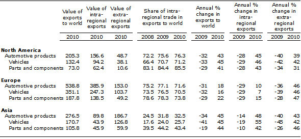 ![]() | Table 4: Exports of automotive products by major exporting regions, 2008-10 $bn and % ![]() Source: WTO Secretariat estimates based on monthly data for available reporters in Global Trade Information Services' Global Trade Atlas database. | |