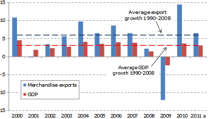 ![]() MORE: > Press release > International trade statistics > Economic research and analysis > 2011 press releases | “The figures show how trade has helped the world escape recession in 2010,” WTO Director-General Pascal Lamy said. “However, the hangover from the financial crisis is still with us. High unemployment in developed economies and sharp belt-tightening in Europe will keep fuelling protectionist pressures. WTO Members must continue to be vigilant and resist these pressures and to work toward opening markets rather than closing them. “Stability” should be the name of the game for 2011”. The 14.5% rise was the largest annual figure in the present data series which began in 1950 and was buoyed by a 3.6% recovery in global output. It was a rebound from the 12% slump in 2009, returning trade to the 2008 peak level and to more normal rates of expansion. Nevertheless, the financial crisis and global recession continue to have an impact, they said. For 2011, the economists are forecasting a more modest 6.5% increase, but with uncertainty about the impact of a number of recent events, including the earthquake and tsunami in Japan. If achieved, this would be higher than the 6.0% average yearly increase between 1990 and 2008 (Chart 1). These figures refer to growth in the volume of world trade, i.e., trade in real terms, adjusted for changes in prices and exchange rates. The projection is based on a consensus estimate of global output growth by economic forecasters, who predict a GDP growth rate of 3.1% in 2011 at market exchange rates. The factors that contributed to the unusually large drop in world trade in 2009 may have also helped boost the size of the rebound in 2010. These include the spread of global supply chains and the product composition of trade compared to output. Global supply chains cause goods to cross national boundaries several times during the production process, which raises measured world trade flows compared to earlier decades. The quantification of this effect would require data on trade in value added that are not currently available. The goods that were most affected by the downturn (consumer durables, industrial machinery, etc.) have a larger share in world trade than in world GDP, which increased the magnitude of the trade slump relative to GDP in 2009, and which had a similar positive effect during the recovery of 2010. The short-term outlook is clouded by a number of significant risks factors in addition to the catastrophes in Japan. These include rising prices for food and other primary products, and unrest in major oil exporting countries. Adverse developments in any of these areas could potentially set back the economic recovery and limit the expansion of trade in the coming year. The full impact of the Japanese disaster is particularly difficult to gauge since it is complicated by a simultaneous nuclear incident, which is hampering relief and rebuilding efforts. The limited amount of research on the economic consequences of natural disasters suggests, however, that the trade impact should be relatively small, especially in the in the medium-to-long term. Higher prices for primary commodities and the extraordinary growth of trade in developing Asia helped boost the combined share of developing economies and the Commonwealth of Independent States (CIS) in world exports to 45% in 2010, its highest ever. Developed economies recorded export growth of nearly 13% in 2010, compared to a 16.5% average increase in the rest of the world. China’s exports increased in 2010 by a massive 28% in volume terms. Chart 1: Growth in volume of world merchandise trade and GDP, 2000-11 a Annual % change ![]() a Figures for 2011 are projections Source: WTO Secretariat. Putting the trade recovery into perspective Although the growth of world exports in 2010 was the fastest on record in a data series going back to 1950, it might have been even faster if trade had quickly reverted to its pre-crisis trend. This did not happen. The rebound was strong enough for world exports to recover their peak level of 2008, but it was not strong enough to bring about a return to the previous growth path (Chart 2). The 3.6% growth rate of world GDP for 2010 is also less robust than it might appear at first glance. It was above its average rate of 3.1% between 1990 and 2008, but it was far from a record. In fact, world GDP growth equalled or exceeded 4% several times in recent years, including 1997, 2000, 2004 and 2006. Considering the depressed level of world output in 2009, growth in this range or higher would not have been surprising in 2010. A number of factors combined to make trade and output grow more slowly than they might otherwise have done. First, curtailment of fiscal stimulus measures in many countries dampened economic activity in the second half of the year. European governments in particular moved toward fiscal consolidation in an attempt to reduce their budget deficits through a combination of spending cuts and revenue measures, with negative consequences for short-term growth. Second, although oil prices stabilized at around $78/barrel in 2010, they were still high by recent historical standards (e.g. oil prices averaged $31/barrel between 2000 and 2005). Prices were below the $96/barrel average seen in 2008, but they were also up 30% from 2009, raising energy costs for households and businesses. Finally, persistent unemployment prevented domestic consumption from rebounding more strongly in developed countries and limited income growth and import demand. The OECD average unemployment rate was 8.6% in 2010 (up from 6.1% in 2008), and unemployment remained at or near 9% in the United States throughout the year. The record expansion of trade and the revival of economic activity in 2010 were certainly welcome developments, but their importance should not be overstated. Despite the rebound, the negative impact of the financial crisis and global recession are likely to pe