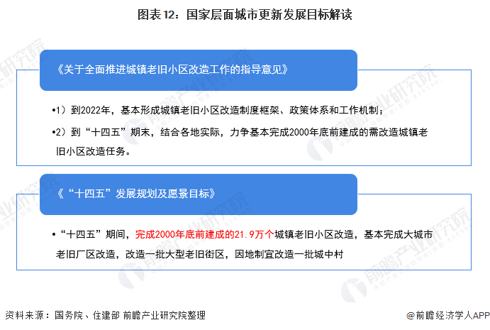 一方面,根据国务院2020年7月公布的《关于全面推进城镇老旧小区改造工作的指导意见》,其中针对2022年和“十四五”期末确定了发展目标;另一方面,根据《“十四五”发展规划及愿景目标》,其中明确,“十四五”期间,完成2000年底前建成的21.9万个城镇老旧小区改造,基本完成大城市老旧厂区改造,改造一批大型老旧街区,因地制宜改造一批城中村。