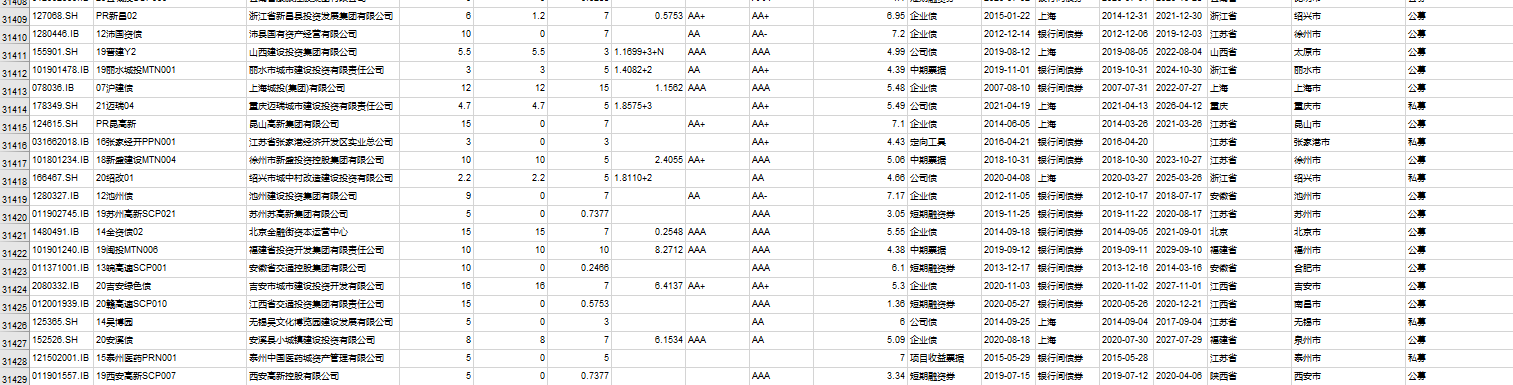 数据指标:代码、债券简称、发行人、发行规模(亿元)、债券余额(亿元)、发行期限(年)、特殊期限(年)、最新债项评级、最新主体评级、票面利率(发行参考)、债券类型、上市日期、上市地点、起息日、到期日、发行人省份、发行人城市、发行方式