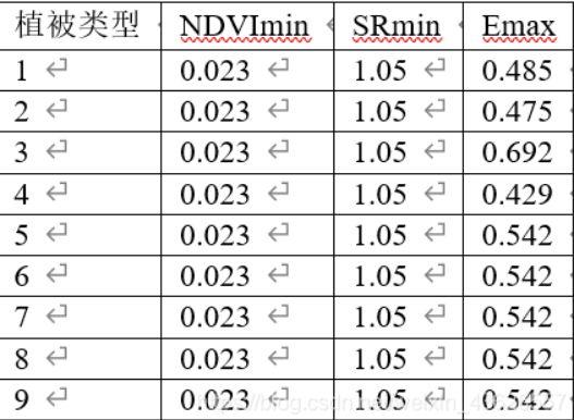 引用朱文泉教授研究结果,配置 9 类植被类型的 NDVImax、NDVImin、SRmax、SRmin 和 Emax(理想状态下最大光能利用率)参数。 其中 NDVImax 和 SRmax 的计算需要东北地区植被类型图和 NDVI 时间序列最大值数据。