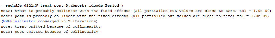 13601022585 发表于 2022-2-28 16:46 请问DID和固定效应一起使用时,stata提示政策实施变量(treat)和时间变量(post)与固定效应产生多重共线性 ...
