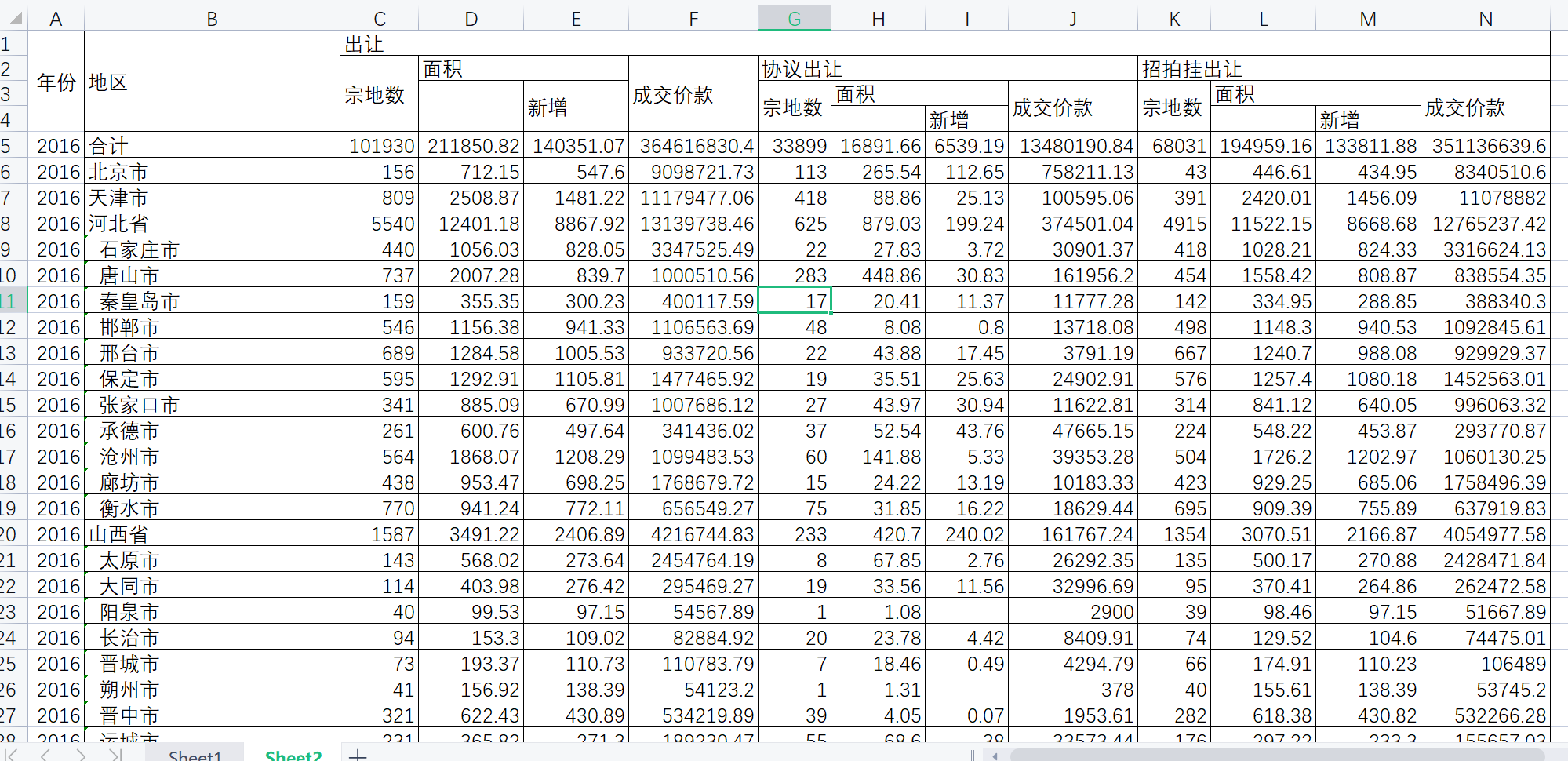 该份数据包含全国31个省所有地级市出让的土地宗数、成交价格以及相较于上一年土地面积的增长量。