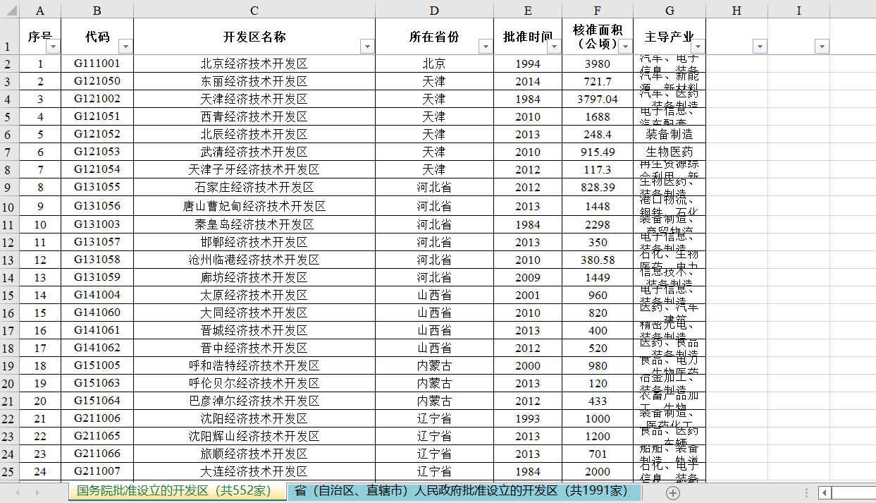 中国开发区审核公告目录(2018版)excel(自己整理的)数据包含:开发区名称、所在省份、批准时间、核准面积和主导产业。国务院批准设立的开发区、省(自治区、直辖市)设立的开发区。excel版本方便进行分析。