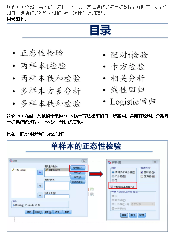 这套PPT介绍了常见的十来种SPSS统计方法操作的每一步截图,并附有说明,介绍每一步操作的过程,讲解SPSS统计分析的结果。