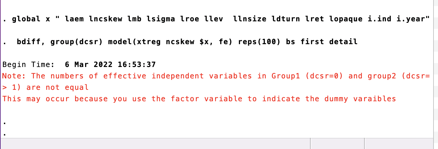 面板数据分组回归用bdiff进行组间系数检验时,老是出现这个问题是什么原因,求助各位老师同学!!!