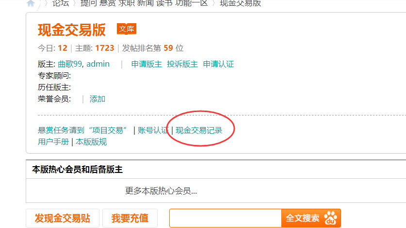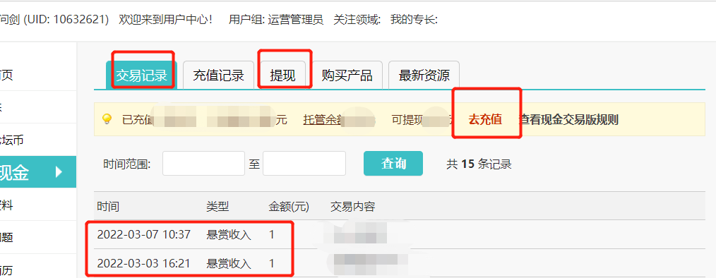 2)、坛友可以查看“交易记录、充值记录、提现(记录)”等,也可以点击“去充值”,可以充值到自己的账户,方便用户进行资金的悬赏以及购买论坛需要现金结算的资源。其他比如项目交易等可自行查看