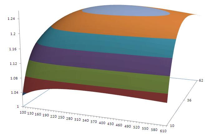 接近水平、稍微向下倾斜的线是X轴,表示农民消耗铁器数量;最左边完全垂直的线是Z轴,表示的是(1+剩余价值率);最右边倾斜的线是Y轴,表示的是铁匠消耗粮食数量。这个图是一个XYZ轴的三维曲线图,该三维曲线在Z轴上的最高点是X=36, Y=360, Z=1.25。