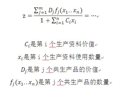 二维生产函数是对社会再生产过程的最少概括,它抽象的表示了两大部类产品的生产情况,通过该二维生产函数可以计算到两大部类产品的价值和剩余价值率。下图中方程式(1)是二维生产函数的一般形式——剩余价值率方程式;方程式(2)是在第一部类产品价值假设为1情况下的第二部类产品的价值的一般形式;方程式(3)和(4)是计算均衡生产状态下的生产资料消耗数量,计算出的结果代入到方程式(1)和(2)中即可得到均衡生产状态下的剩余价值率和第二部类产品价值。