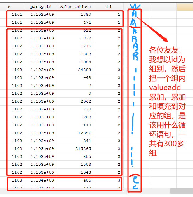 各位大佬,我想问问我想把一个有300多组的数据,每组的增加值累加后,填充到对应的w组中,有什么便捷方法吗