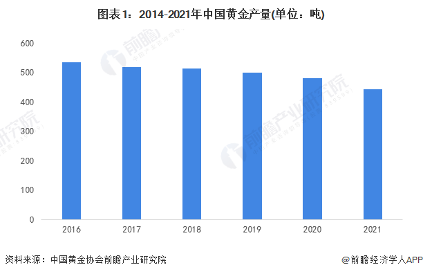 黄金是一种特殊的贵金属,具有商品和金融双重属性,黄金需求主要分为商品制造消费和市场投资需求两大类。随着我国黄金市场的发展,我国已经形成了黄金加工制造、批发零售、租赁融资、资产配置、投资贸易等多层次、多形式、多功能的市场需求体系。从我国黄金产量数据来看,我国黄金产量从2016年以来进入滑坡通道,2021年,我国共生产黄金443.6吨,同比下降7.5%。其中,国内黄金原料供应趋紧,利用国内原料生产黄金329吨,同比下降10%;利用进口原料生产黄金114.6吨,同比增长0.4%。