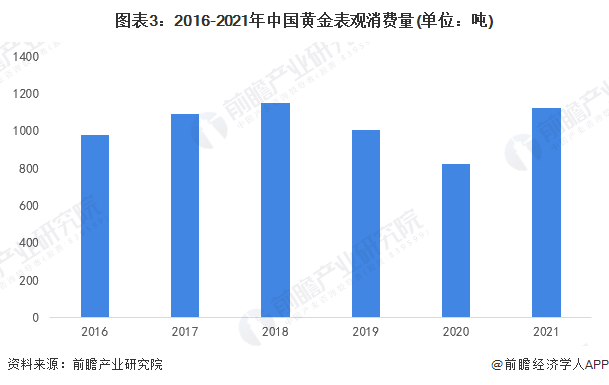 从我国黄金消费需求来看,我国黄金消费数量呈现波动变化,2018年,全国黄金消费量达1151.43吨,达近年来新高。随后两年我国黄金消费需求有所回落,2020年受疫情影响,全年黄金消费需求进一步下降至821吨,为近几年最低值。2021年全年,我国黄金消费量1121吨,同比增长36.5%,已恢复致2018年高点附近。