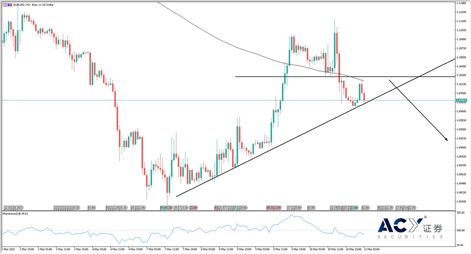 从欧美小时图来看,经过昨日的大涨大跌,欧美的头部成型,今日早盘出现回踩行情,下跌动力较强。200均线向下,和颈线一起提供强阻力。指标方面,动量指标在下穿零线后始终保持在零线下方,体现多头耗尽空头入场。考虑到战争局势并不明朗,入场尽量以左侧交易逢高做空为主。现价上方的阻力主要集中在1.102的颈线附近,头部结构将提供很好的供给区机会,也可以等待价格下穿趋势线后,触发反转信号入场。下方支撑主要看底部1.092位置。