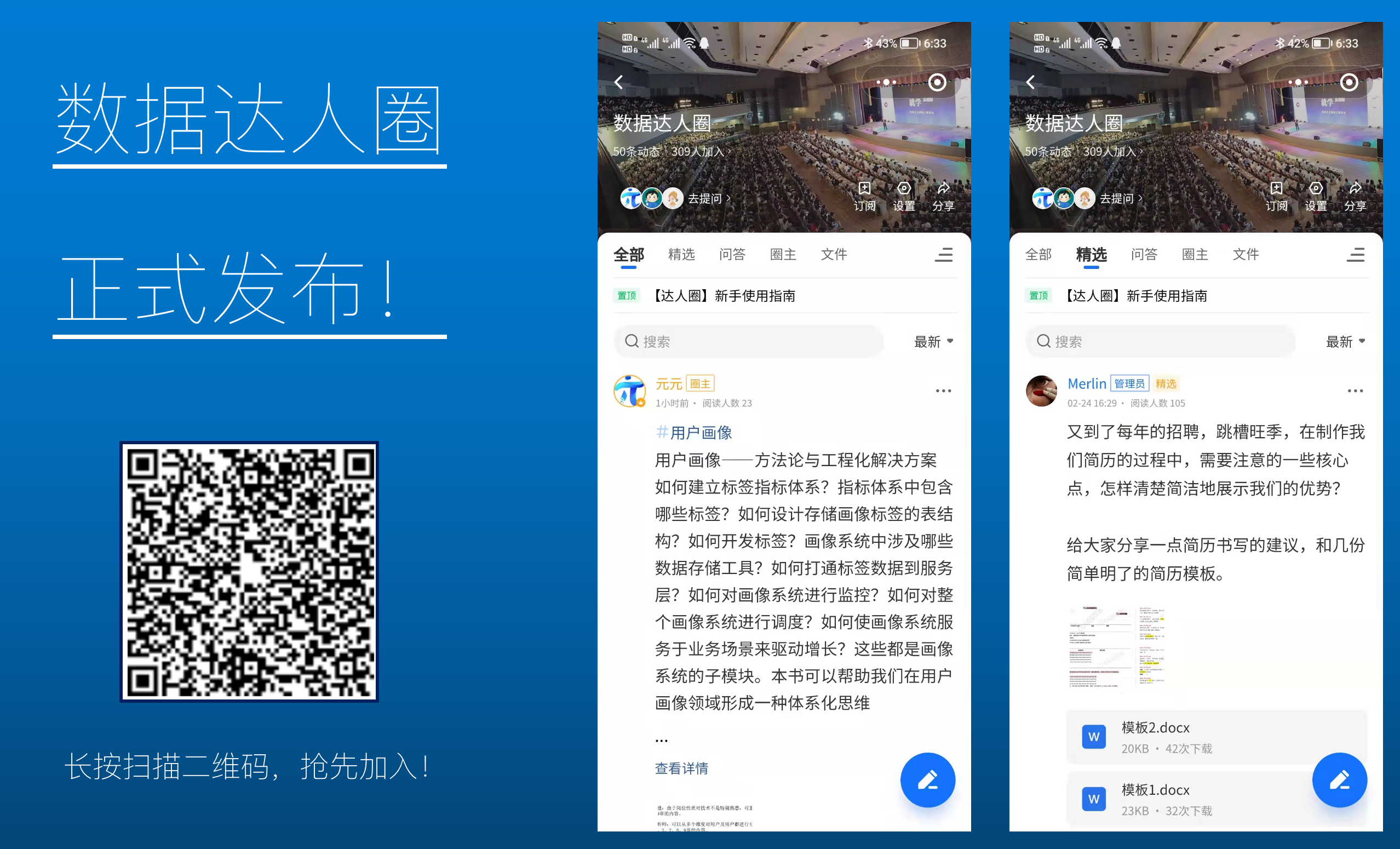 “数据达人圈”是一批由与数据打交道多年的职场达人们共同发起,聚焦商业分析、数据科学领域,无论您是从数据分析、数据挖掘、数据治理等数据相关岗位,还是从事产品运营、市场营销、财务经营等业务相关岗位,都可以在圈子里培养自己的底层数据思维、提升数商(DQ)、获取达人们的成功实战经验。
