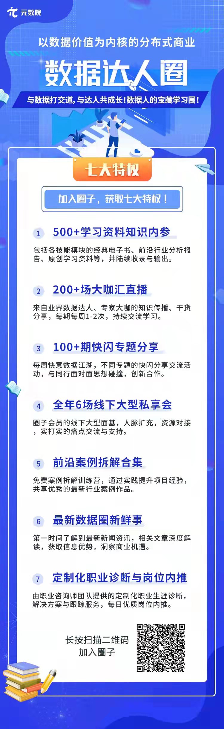 我们总结了过去十年对于“商业数据分析”领域的洞察与研究,汇聚了满足大量个性化需求的优质的学习资源,聚集了数百位职场数据达人,组建了一个以数据价值为内核、以内容为价值中枢的优质圈子: