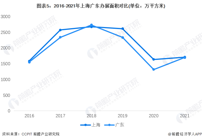 对比上海和广东近年来办展面积的变化情况,上海市的历年办展面积基本均要高于广东省,仅有2018年时有所例外。