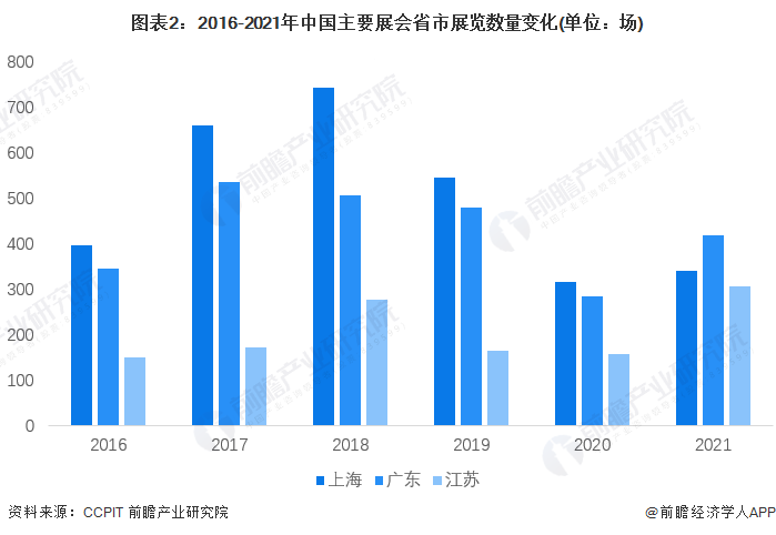 从我国2021年会展行业重点城市的整体趋势来看,上海市与广东省是我国一直以来的办展大省,且上海市的办展数量一直多于广东省。直到2021年,广东省的办展数量才首次反超上海,成为了国内办展数量第一的省份。